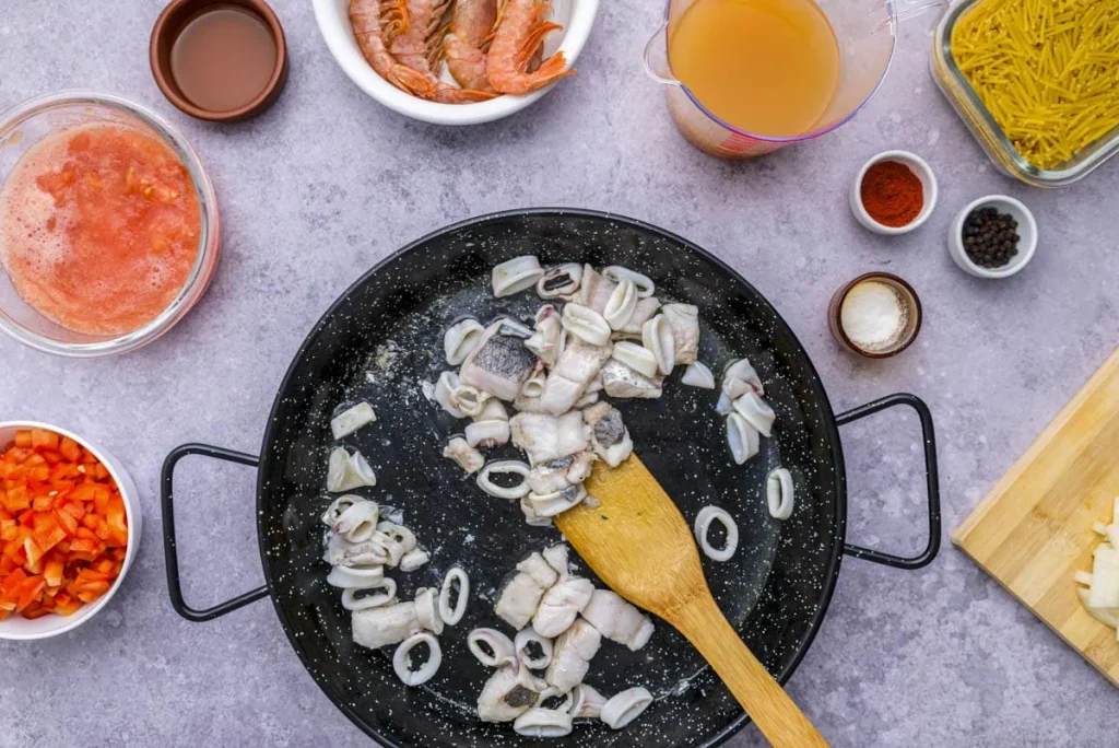 There are different versions of Fideuá, but core ingredients usually include a mix of fish (such as monkfish, hake, or any “meaty” fish) and seafood (prawns, mussels, clams, etc.).