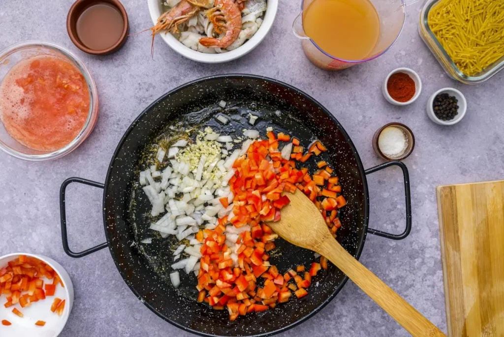 • Add the rest of the olive oil to the (now empty) paella pan and sauté the onion, red bell pepper and garlic over medium heat for 7-8 minutes, or until golden and fragrant. Stir regularly.